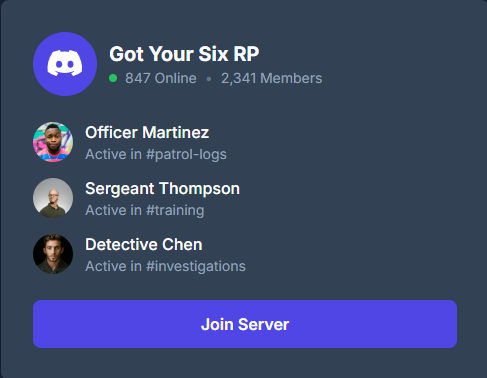 Got Your Six RP operates with strict standards for professionalism and immersion. We maintain a structured environment where serious roleplay thrives, supported by active moderation and a community committed to authentic law enforcement simulation.